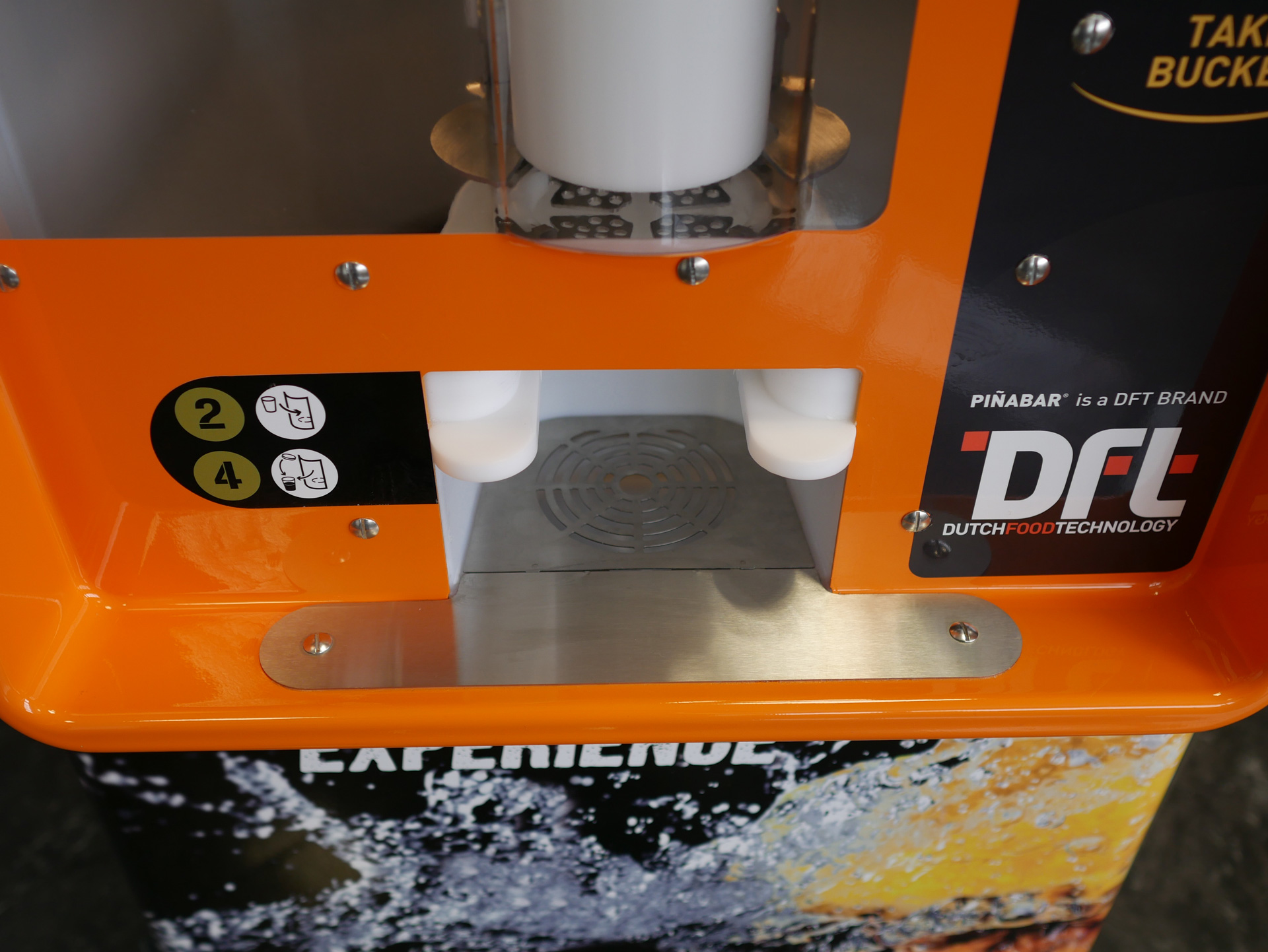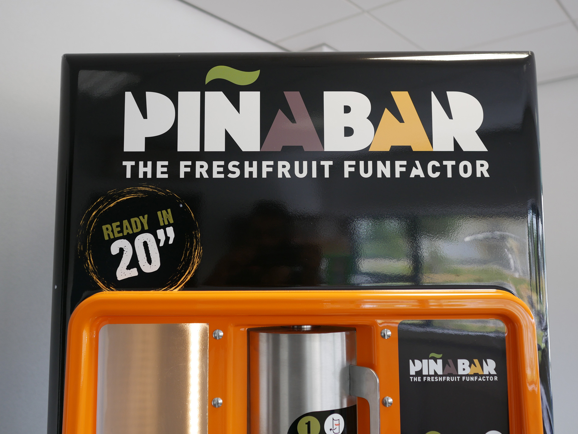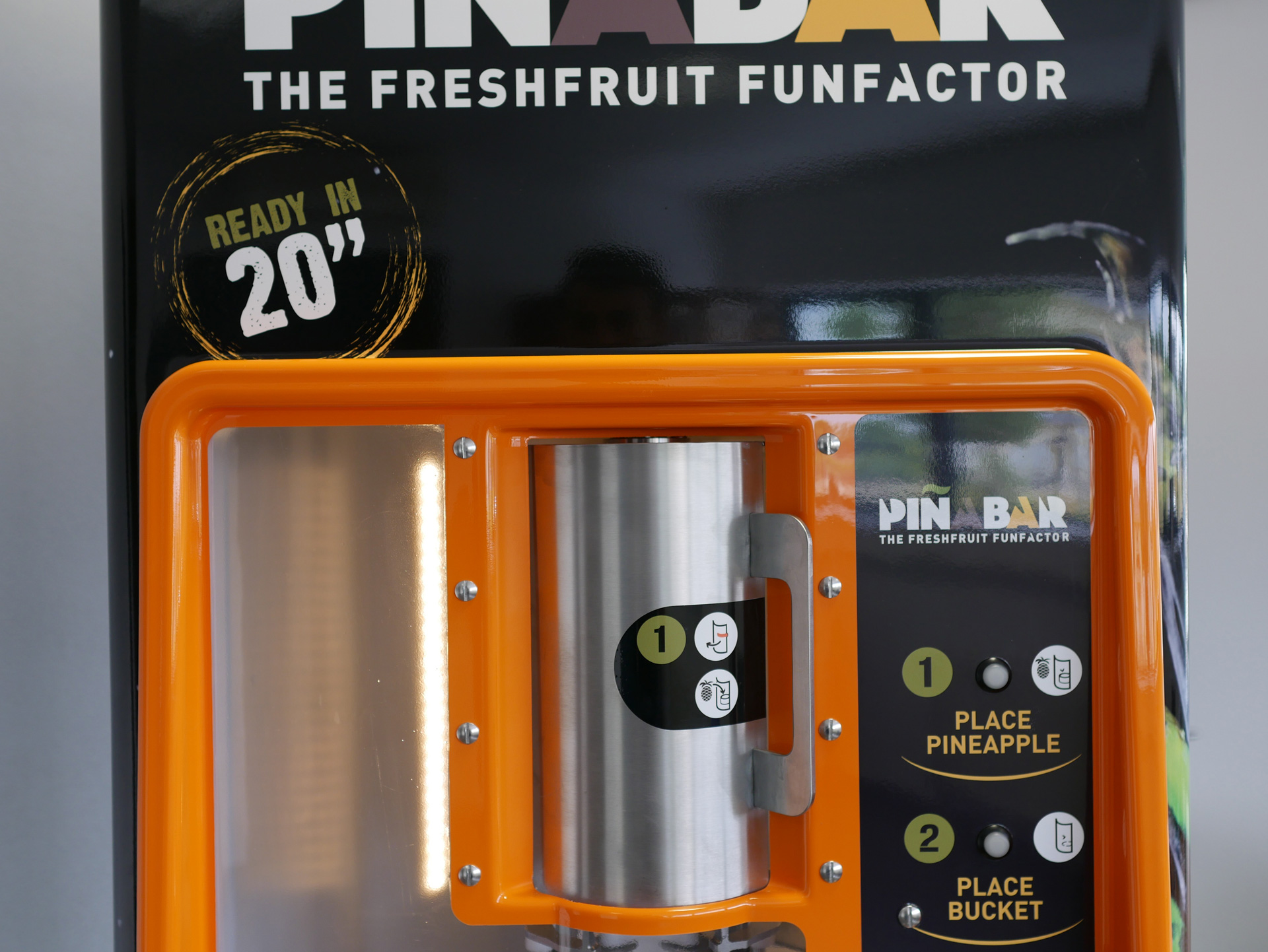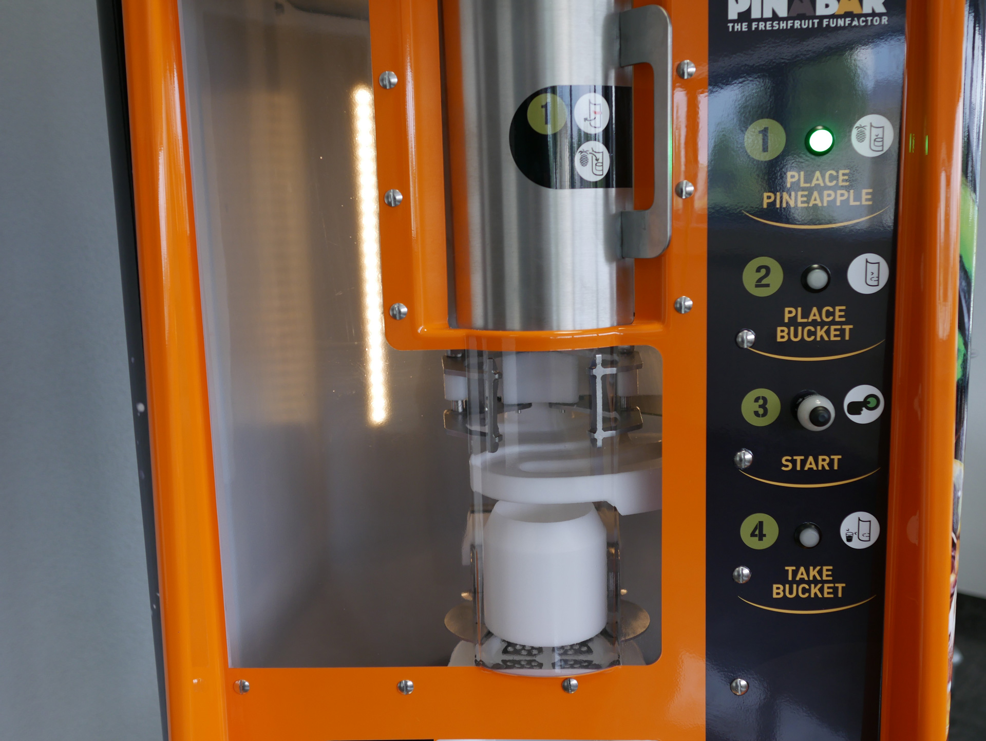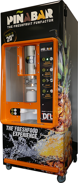 Il Piñabar è una macchina molto facile da usare e massimizza l’esperienza dell’utente. Inserendo solo un ananas e un secchio la macchina è pronta per essere utilizzata. Con la semplice pressione di un solo pulsante il cliente può vedere, attraverso la nostra porta trasparente, come l’ananas viene tagliato e lasciato cadere nel secchio.